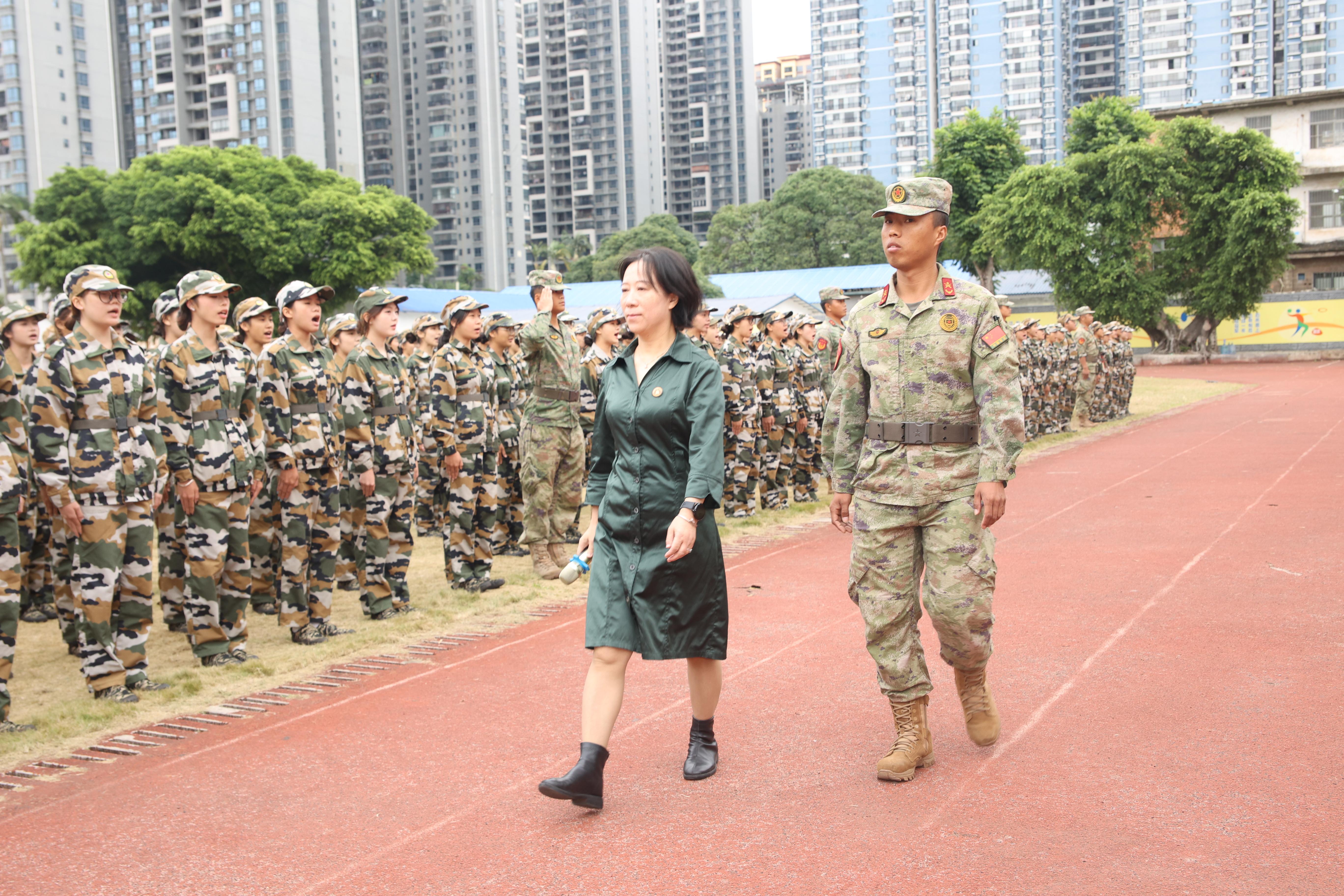 东校区军训团团长陪同校长莫海燕检阅学生方队
