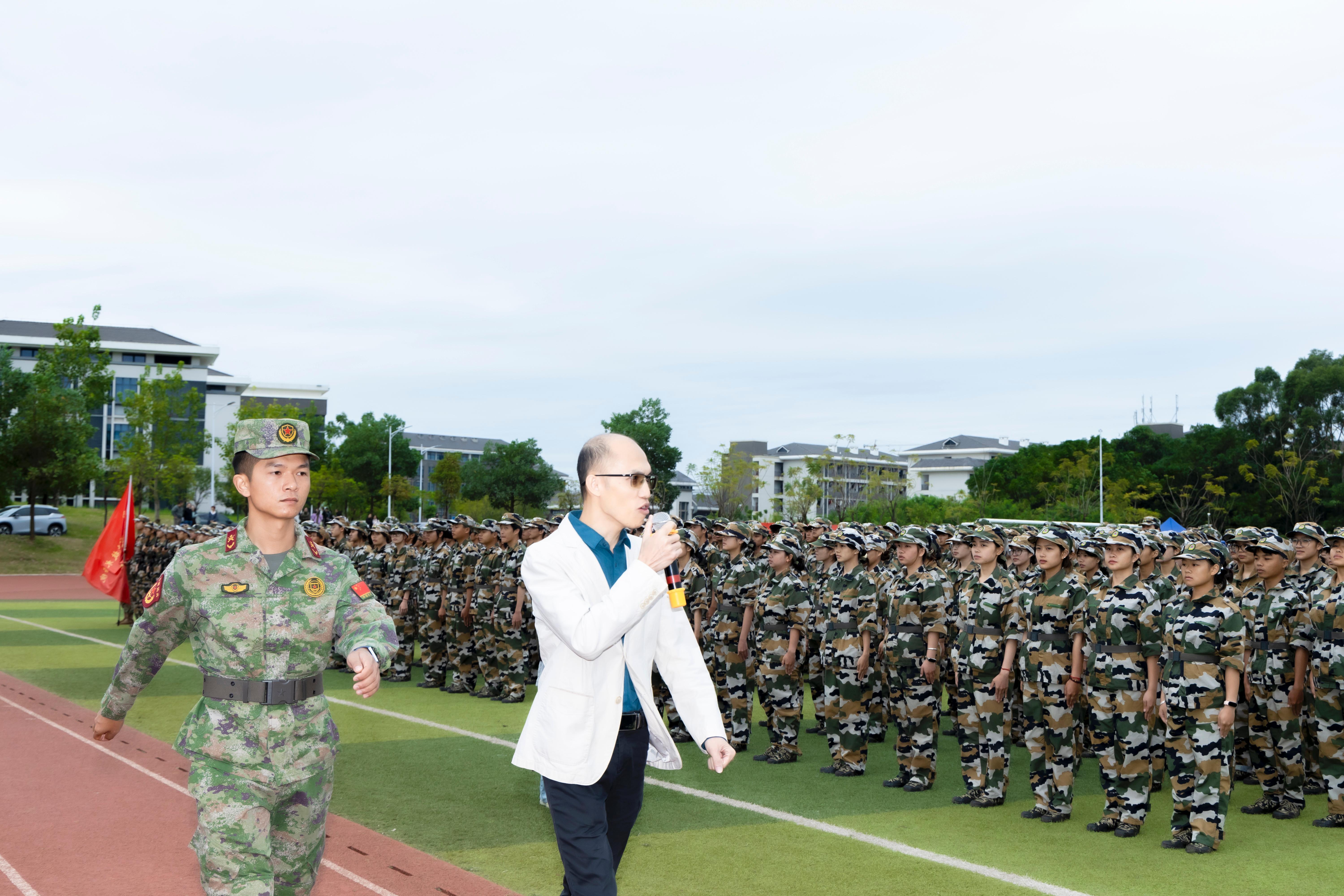 大会在雄壮的国歌声中拉开帷幕,两校区军训团团长陪同学校校长莫海燕、纪委书记覃炳达检阅学生方队。