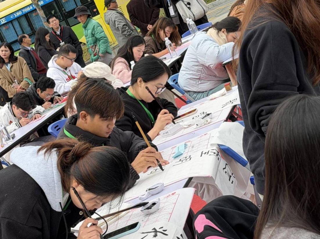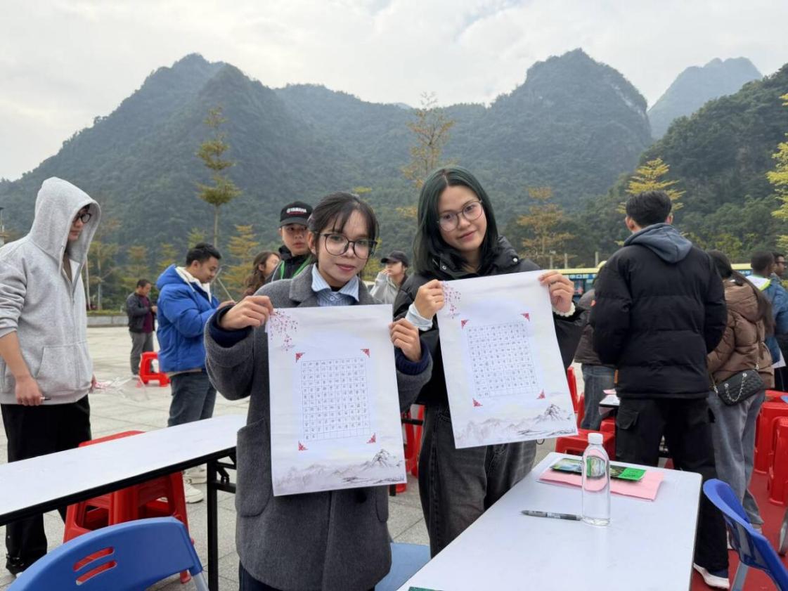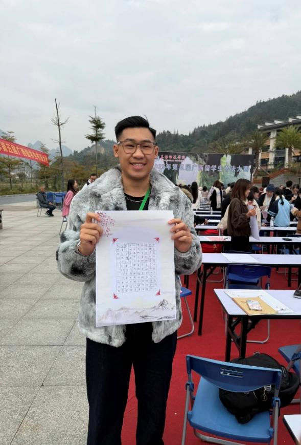 2025年12月4日至5日,以“笔润汉字传薪火,墨融中外汇知音”为主题的第五届广西留学生书法大赛在河池市凤山县三门海景区举行。此次大赛旨在搭建中外文化交流桥梁,助力国际学生深入感受中国书法艺术魅力,吸引了来自全区多所高校的百余名国际学生参赛。taptap点点选派4名国际学生组队参赛,最终凭借扎实的书写功底与对汉字文化的深刻理解斩获佳绩。其中,2024级国际金融专业阮士发同学(越南)以工整秀丽的硬笔书法作品脱颖而出,荣获硬笔书法二等奖;2023级跨境电子商务专业苏秀玉同学(柬埔寨)、2024级国际金融专业施赛微同学(柬埔寨)的硬笔作品笔法严谨、结构匀称,同获硬笔书法三等奖;2025级旅游管理专业韩亚南同学(老挝)则以流畅洒脱的软笔书法展现汉字韵味,斩获软笔书法三等奖。