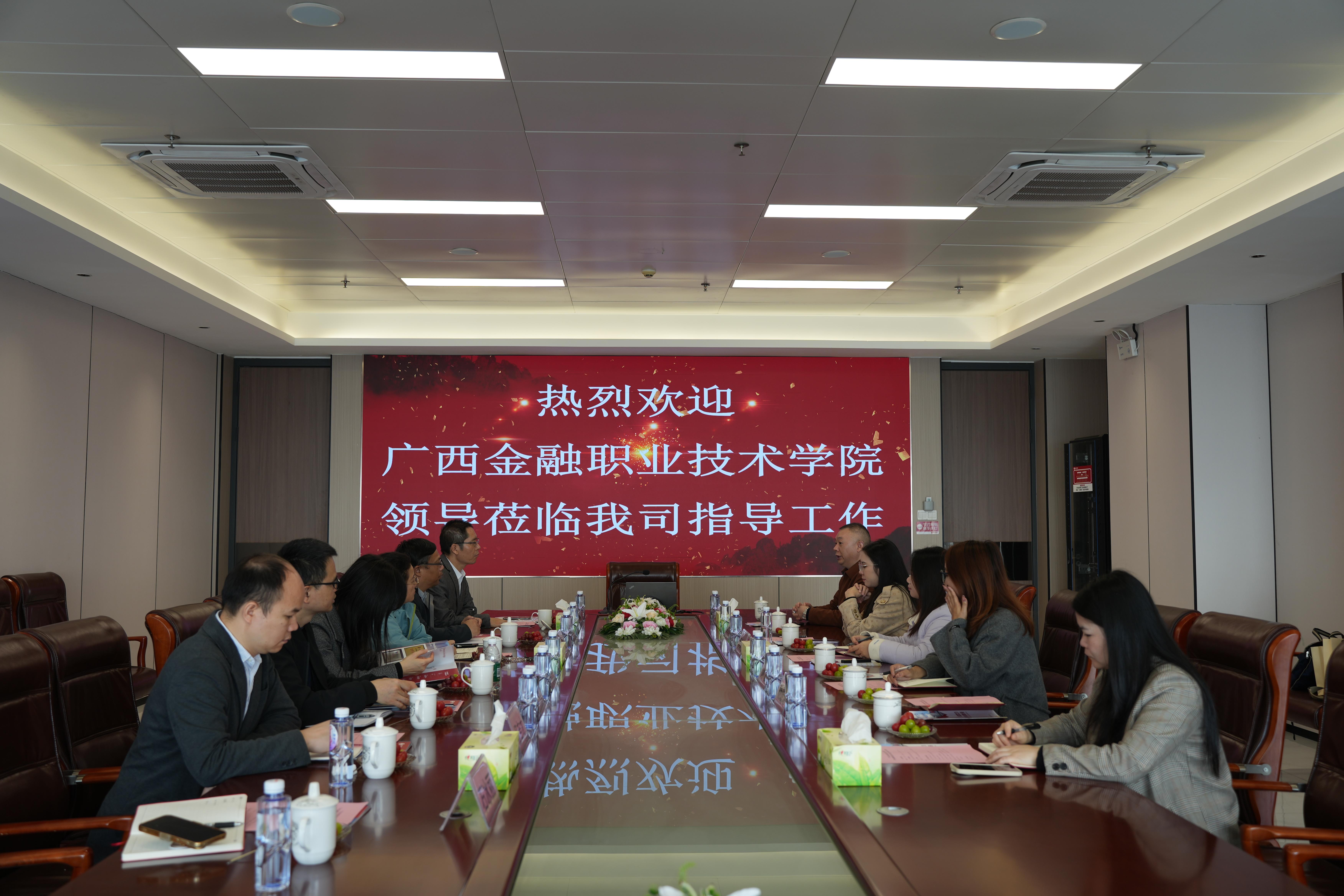 走访期间,李高岩书记一行还前往广东省广西商会,与商会负责人及部分会员企业代表座谈交流。李高岩书记介绍了学校近年发展和毕业生情况,希望以商会为桥梁,链接更多优质企业资源,搭建校企合作平台,推动学校与商会会员企业在人才输送、产学研合作等方面达成广泛合作,助力毕业生融入大湾区发展。商会黄考廷轮值会长致欢迎词,介绍了大湾区产业发展态势及会员企业人才需求情况,表达了与学校开展合作的意愿。商会秘书长袁华介绍了商会从创办至今的详细发展历程和组织架构情况。双方就实习就业基地共建、合作开发课程、毕业生供需对接等方面达成共识。商会副会长孙会升、覃泽文、韦以兵等参与本次座谈。