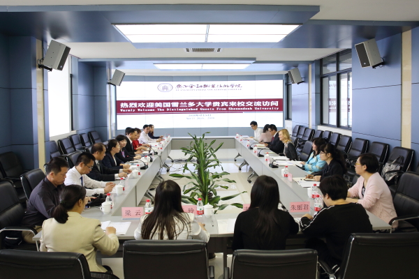 4月26日,美国雪兰多大学副校长艾德丽安.布劳斯,文理学院院长杰夫.科克尔,国际关系部主任伊冯.陈一行来访taptap点点。taptap点点党委书记沈立君携副院长谢沛善,院长助理罗坚及国际交流处、合作与交流中心、学生工作处、教务科研处、各系部和相关人员在西校区协同育人中心会见了雪兰多大学代表团一行。