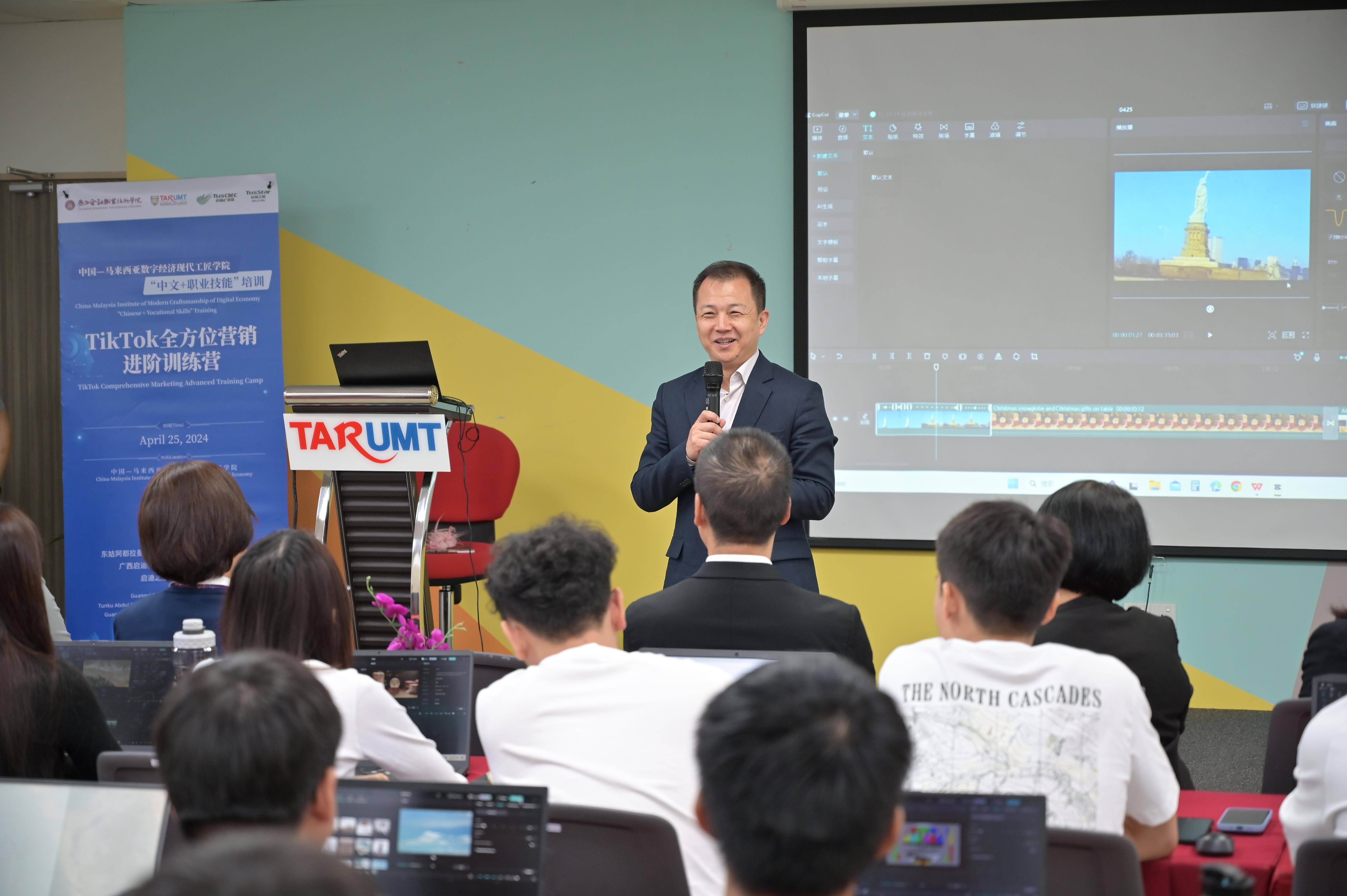 闫炳辰对数字现代工匠学院的建设给予了充分肯定。他表示,这一项目不仅有助于提升两国教育水平,还将为两国企业“走出去”提供有力的人才支撑。同时,他也向正在数智中心举办的首期“中文+职业技能”——TikTok全方位营销进阶训练营的学员们表达了亲切的问候,并为他们送上了殷切的寄语,鼓励他们把握机遇,不断提升自身技能,为两国的数字经济合作贡献自己的力量。